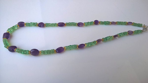 This gorgeous necklace features an array of sparkling gemstones in soft jewel tones: purple, golden yellow and aqua. The gems include amethyst, apatite, and citrine. The necklace length is about 20 inches and it comes with a sterling silver clasp.