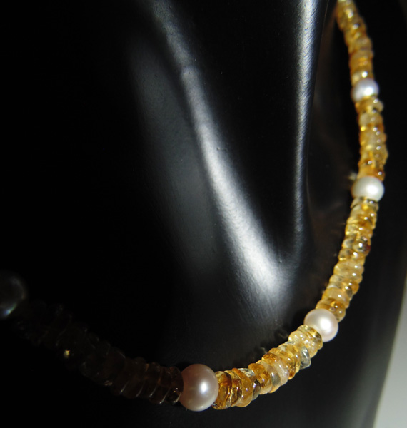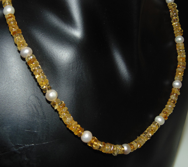 Golden Citrine and Pearl Necklace with Sterling silver clasp. Beautiful Necklace suitable for any dressy occasion. It measures about 18″ long.