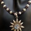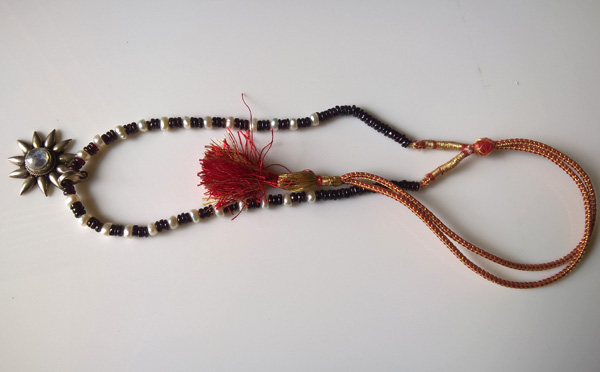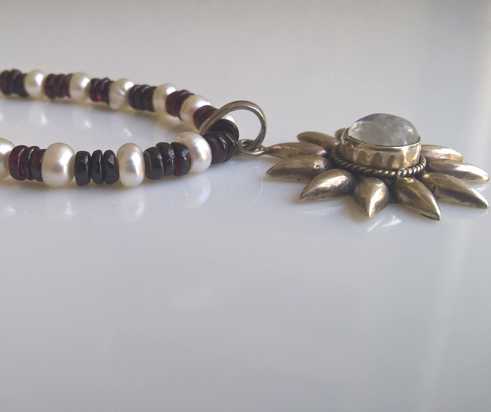 A beautiful and elegant Garnet and fresh water Pearls necklace with a beautiful Labradorite studded sterling silver pendant. This beautiful and precious necklace would be a piece of valuable jewellery for every occasion. It comes adorned with a “dori” (no clasp).