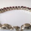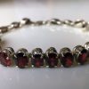 A beautiful sterling silver bracelet studded with Garnet stones. The length of bracelet is 8 inches and the width is about 7 mm. It comes with a lobster claw clasp. Total bracelet weight is about 70 carats (14 grams).