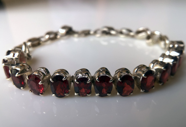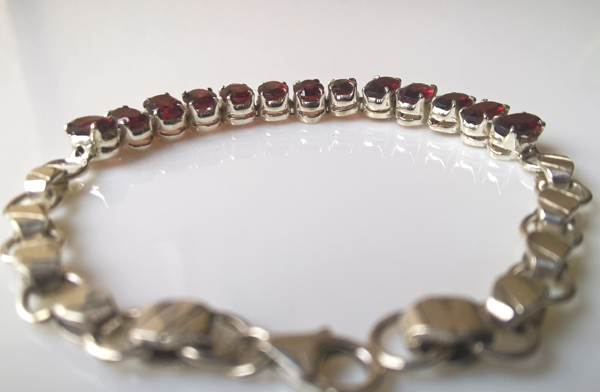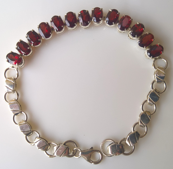 A beautiful sterling silver bracelet studded with Garnet stones. The length of bracelet is 8 inches and the width is about 7 mm. It comes with a lobster claw clasp. Total bracelet weight is about 70 carats (14 grams).