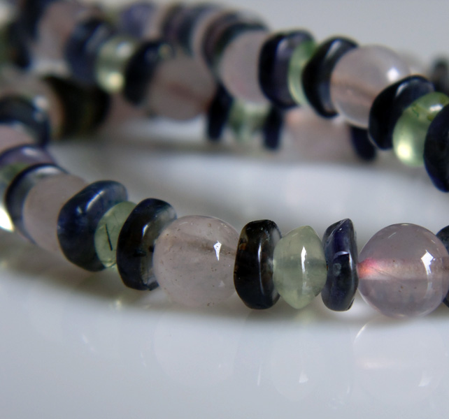 A beautiful necklace featuring soft jewel tones of light pink Rose Quartz, blue Iolite and light green Prehnite. The necklace length is about 45cms (18 ins) and it comes with a sterling silver clasp.